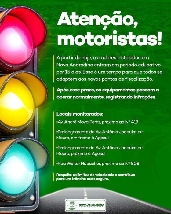 A Prefeitura de Nova Andradina destaca que a instalação dos radares faz parte de um conjunto de ações voltadas à segurança viária e à preservação de vidas no trânsito. Respeitar a sinalização e os limites de velocidade é uma atitude que contribui diretamente para a construção de uma cidade mais segura e com melhor qualidade de vida para todos.