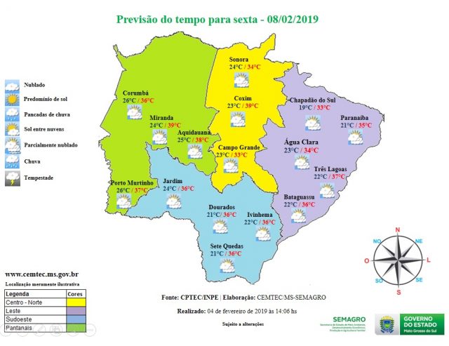 Na Capital, a chance de chuva é de 80% com ventos de até 10km. Regiões turísticas, como Bonito, Bodoquena e Pantanal devem registrar forte calor durante o dia, as mínimas são de 23ºC e máxima de 36ºC, com chance de chuva no fim do dia. A sensação térmica nesta região pode ficar em 33ºC.
