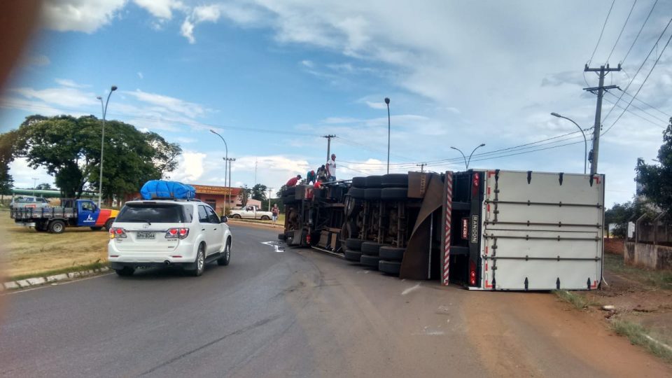 Uma carreta tombou na rotatória da MS-134 com a MS-276, no município de Batayporã (MS), na tarde desta quinta-feira (20).