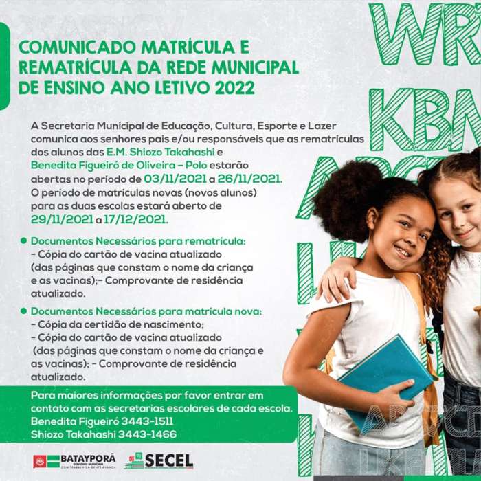 A Secretaria Municipal de Educação, Cultura, Esporte e Lazer comunica aos senhores pais e/ou responsáveis que as rematrículas dos alunos das E.M. Shiozo Takahashi e Benedita Figueiró de Oliveira – Polo estarão abertas no período de 03/11/2021 a 26/11/2021.
