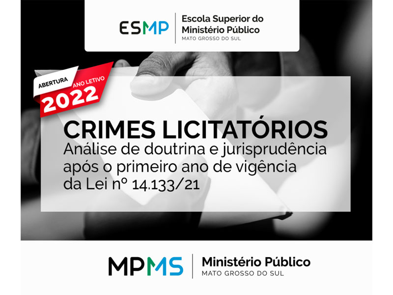 A Escola Superior do Ministério Público do Estado de Mato Grosso do Sul (ESMP-MS) realizará no dia 11 de março de 2022, às 14h, o curso “Crimes licitatórios: análise da doutrina e jurisprudência após o primeiro ano de vigência da Lei 14.133/21” para os membros, servidores e estagiários da instituição.