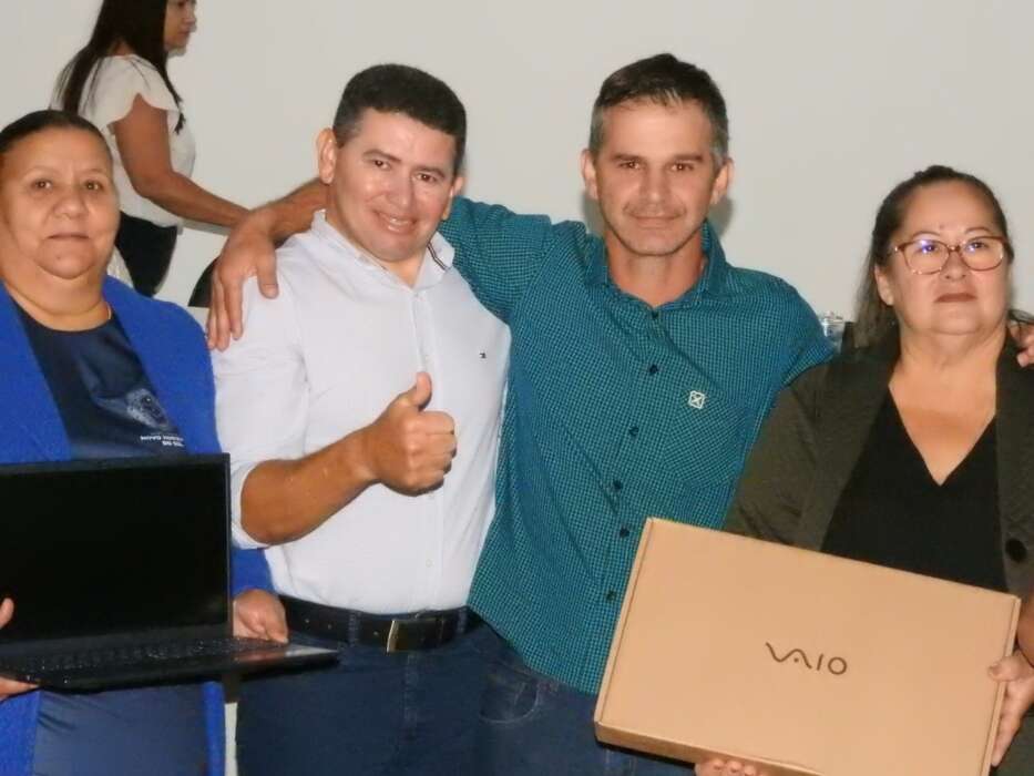 Ao término do discurso do prefeito, aconteceu o início da entrega de 60 notebooks aos professores da Rede Municipal de Ensino. Liderado pelo prefeito Aldenir Barbosa e a Gerente de Educação Andreia Bueno. E mais ainda 30 computadores para a sala de tecnologia.