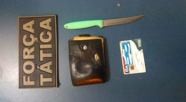 A Equipe da Força Tática estava em rondas pelo centro da cidade de Nova Andradina, quando um homem ao avistar a Viatura, retornou repentinamente no sentido contrário ao da Viatura, acelerando os passos como se fosse correr. Diante da atitude suspeita, foi dada voz de abordagem ao homem e ao ser realizada a busca pessoal foram encontrados em seus bolsos: uma faca de serra e um cartão de credito em nome de outra pessoa.