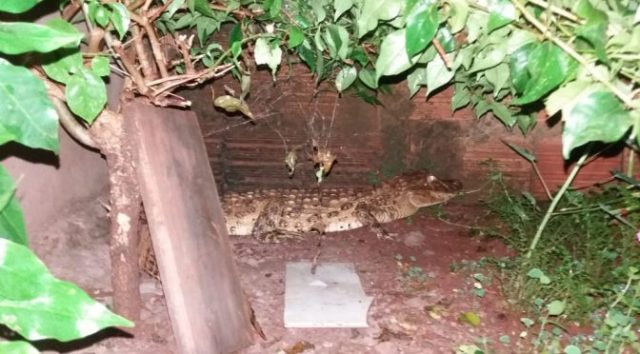 Policiais Militares Ambientais da Capital foram acionados ontem (7) à noite para capturar um jacaré que estava no quintal de uma residência no centro da cidade de Terenos.