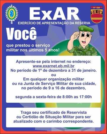 Informa ainda, que a apresentação poderá ser feita pela Internet, no período de 1º de dezembro de 2018 a 31 de janeiro de 2019, pelo Site www.exarnet.eb.mil.br. Vale ressaltar que a última apresentação deverá ser feira de forma presencial na Organização Militar ou na Junta de Serviço Militar.