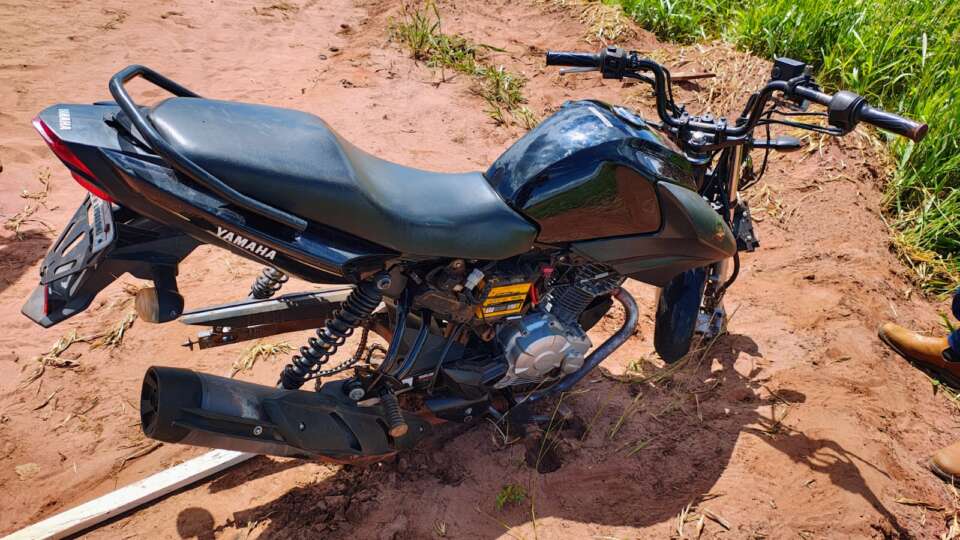 A motocicleta, da marca Yamaha, de cor preta, apresentava sinais de violação, como ausência de rodas, carenagens, painel, placa de identificação e danos no miolo da chave de ignição.