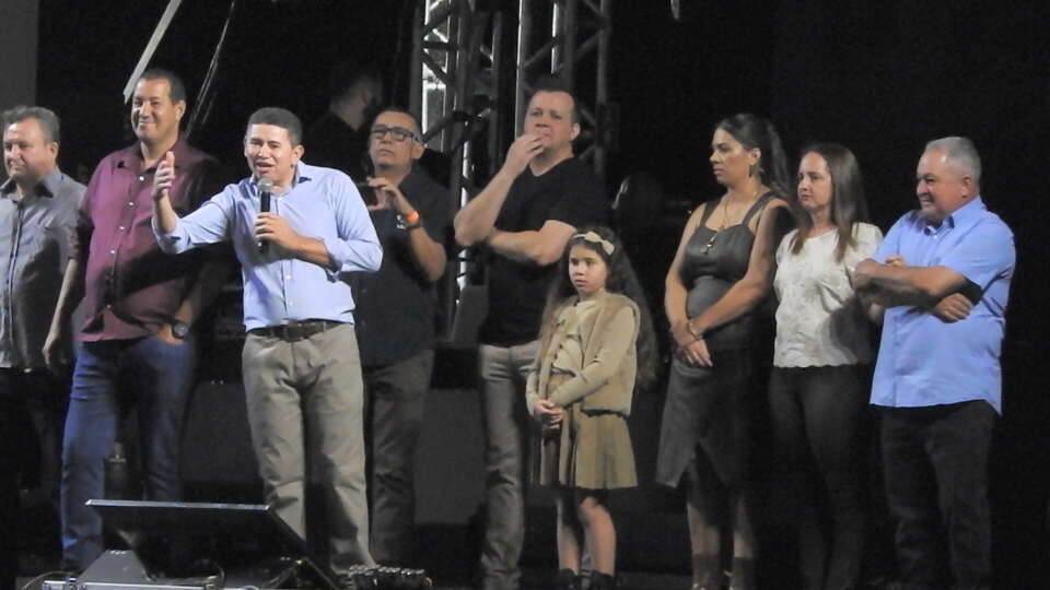 Estavam presente no palco, o vice-prefeito Gil, a primeira dama Adriana Teodoro, presidente da Câmara, vereador Luiz Enfermeiro, dentre outras lideranças.