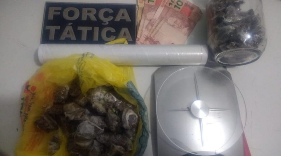 No local a equipe encontrou 70 porções de maconha, uma balança de precisão, usada para pesar o entorpecente, um rolo de filme plástico utilizado para envolver a droga e uma faca de mesa utilizada para cortar a droga.