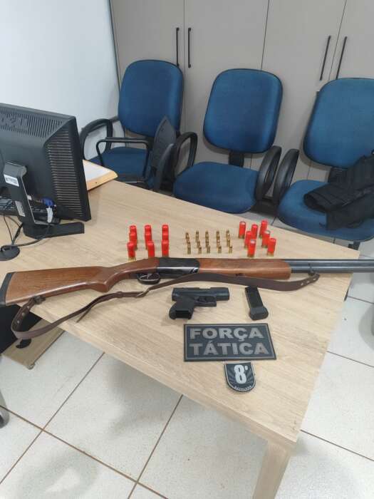 Na verificação, foram apreendidas duas armas de fogo pertencentes ao homem de 42 anos — uma pistola calibre 9mm e uma arma calibre 12 — além de 20 munições calibre 9mm e 16 munições calibre 12. Os envolvidos já eram investigados por um episódio semelhante ocorrido três semanas antes, em outra propriedade rural, onde teriam praticado caça ilegal e danificado cercas, o que reforça a reincidência da conduta.