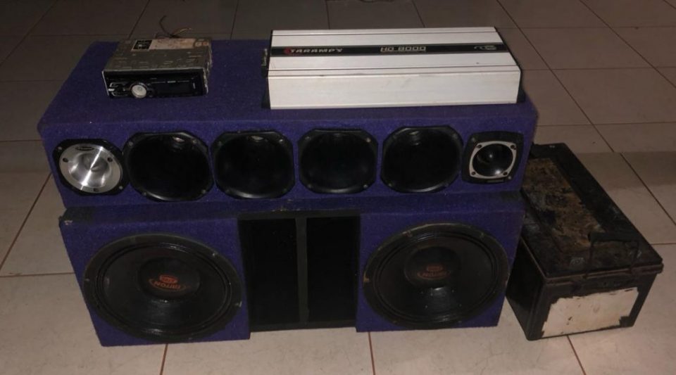 A equipe de Rádio Patrulha realizava rondas pelo distrito quando ouviu um som em volume muito alto. Ao chegar na Avenida Presidente Vargas, encontrou um veículo estacionado, com a tampa do porta malas aberta e emitindo o som.