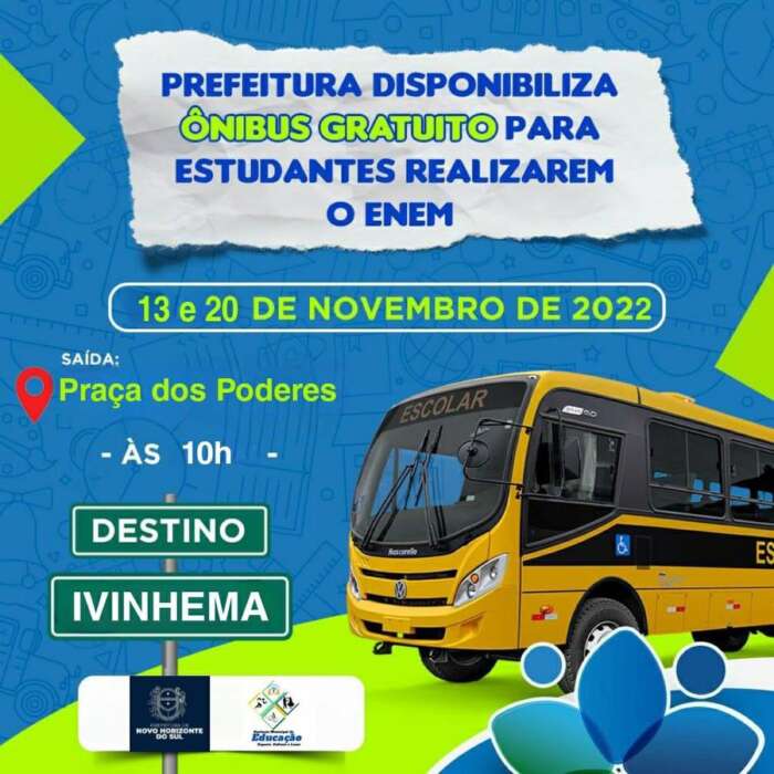 A Prefeitura de Novo Horizonte do Sul está disponibilizando transporte gratuito para os estudantes que vão fazer o Enem (Exame Nacional do Ensino Médio) na cidade de Ivinhema, nos dias 13 e 20 de novembro.