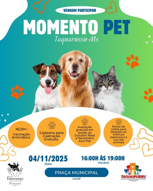 Além disso, haverá cadastro para castrações, orientação e avaliação voltada a Campanha Outubro Rosa e Novembro Azul Pet.
