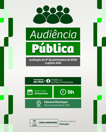 A Prefeitura de Nova Andradina, por meio da Secretaria Municipal de Finanças e Gestão, realizará nesta sexta-feira (26) uma audiência pública para apresentação e avaliação das metas fiscais do 2º quadrimestre de 2025, bem como da Lei Complementar 141/2012, que trata da gestão do Sistema Único de Saúde (SUS).