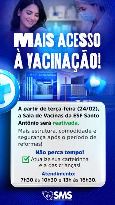 SaúdeReativação da Sala de Vacina do ESF Santo Antônio será na terça-feira 21 de fevereiro de 2026 , 08:4520 de fevereiro de 2026 , 21:490 Compartilhe0 Na terça-feira (24/02), a Sala de Vacinas da ESF Santo Antônio tá de volta! Aproveite faça a atualização da sua carteirinha e da carteirinha das crianças!