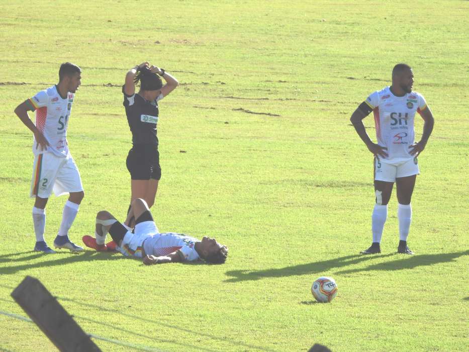 Imagem rara no estádio Andradão:  Árbitra Daiane Caroline Muniz, arruma o cabelo, antes de liberar o atendimento ao atacante Masquerano, da equipe Cena, caído no gramado