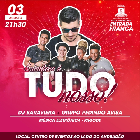 Ao som de música eletrônica, pagode e funk, a primeira edição da “Sabadeira” contará com o setlist do DJ Baraviera que promete agradar os baladeiros de plantão. E pra fechar com tudo a noite de sábado, o Grupo Pedindo Avisa, reconhecido pelo talento, alegria e irreverência, é certeza de muita animação e alegria à galera.