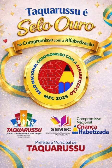 Taquarussu voltou a se destacar no senário educacional conquistando pela segunda vez consecutiva o Selo Ouro no Compromisso Nacional com a Alfabetização, reconhecimento concedido pelo Ministério da Educação (MEC) às redes de ensino que apresentam avanços significativos na alfabetização das crianças. O resultado, referente à edição 2025, destaca o compromisso do município com a alfabetização na idade certa, em alinhamento ao Plano Nacional de Educação (PNE) e ao Compromisso Nacional Criança Alfabetizada.