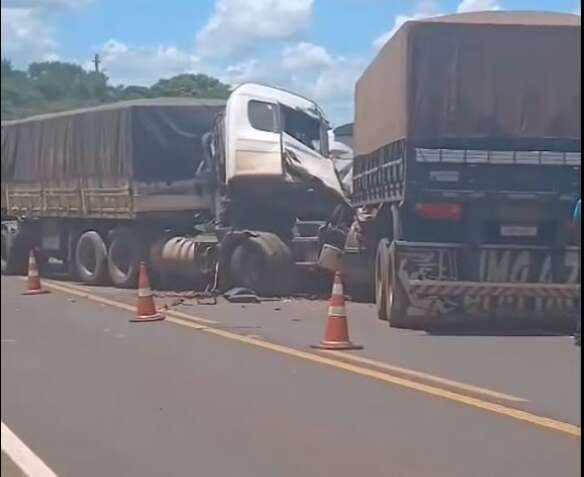 Um condutor ficou ferido após a colisão frontal entre duas carretas, na manhã desta terça-feira (10), na BR-376, entre Deodápolis (MS) e Ivinhema (MS).